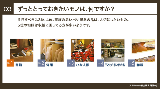現在、日本の住まいから「蔵」が極めて少なくなり、家財道具をしまう場所がなくなってしま いました。一年中同じものが部屋の中に置かれ、四季を楽しむ暮らしやモノを大切にする心が 忘れ去られようとしています。モノがあふれ、家の中が狭くなっている一方で、豊かさの真 の意味が問われているいまこそ、かつての「蔵」のような収納を見直すときではないでしょうか。 ミサワホームがご提案している大収納空間「蔵」には、日本人が永い歳月の中で培って きた生活文化の継承という願いが込められています。